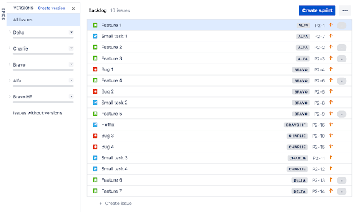 This sample depicts a small project with a smattering of issues, split into the Alfa, Bravo, Charlie, and Delta releases. With this view, we can look at how to organize our branches in source control in a clean and effective way.
