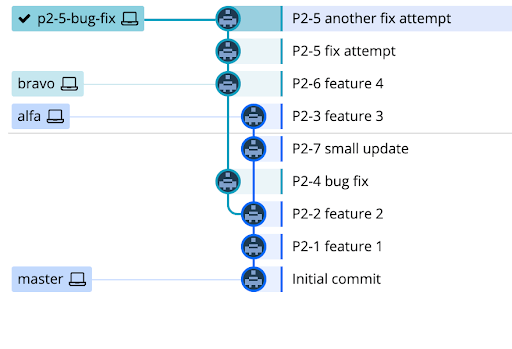 You can also use hashes as references to specific commits. If we had deleted the local alfa branch in the example above, we would still need to be able to reference the old base. If the sha of P2-3 feature 3 was 461526, then the command would look like this: