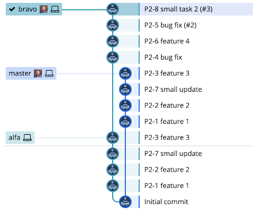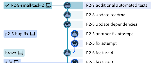 The alfa release branch has been merged to main, and alfa has been released to production. The bravo branch should now be based on main, instead of on the remaining local version of the alfa branch. A simple rebase in this case will replay all of the commits from alfa onto main, where they already exist, causing a potential big headache of merge conflicts. With the --onto options, we can tell Git that we want to “rebase just the four commits in bravo, starting with P2-4 bug fix commit”. The first argument will be the new base we want (main), and the second argument will be the current base we want to rebase from (the HEAD of alfa). With the bravo branch checked out, this command would look something like this