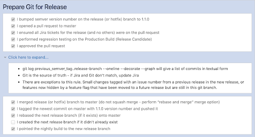 Before I wrap up, I want to share one more key element of the delivering code process; checklists. The goal here is to make releasing code quick, easy, and as fool proof as possible. More often than not, the biggest point of failure in all of this are the humans. Have you ever released code out to production, only to realize a few days later that you forgot a small but important step in the process? Accidentally including unfinished code, forgetting to update version numbers, or even releasing code in a wrong build configuration. I’ve seen it happen, and it’s never pretty. We follow a checklist to ensure that sort of thing never happens. We use one that looks a lot like this: