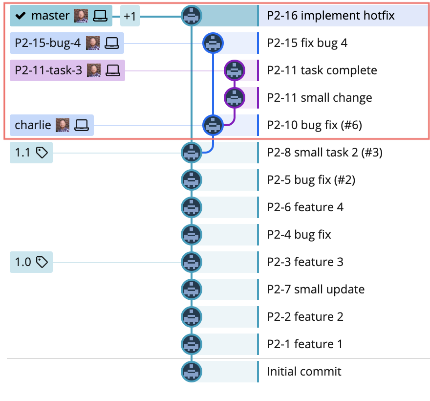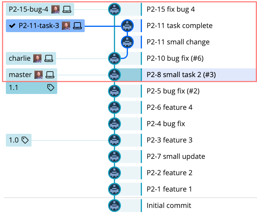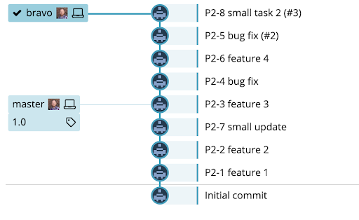 Let’s say we’ve moved ahead and the Bravo (v1.1) release is in production. Now we’ve started working on the Charlie release. Here’s how the repo looks: